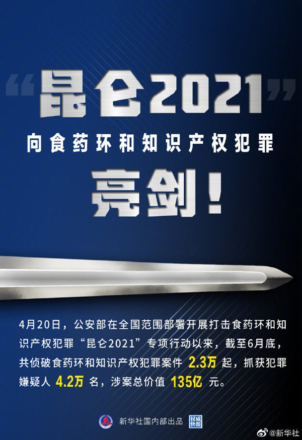 呵護(hù)“舌尖上的安全”、保障醫(yī)療用藥安全、打擊侵權(quán)假冒犯罪、打擊破壞生態(tài)環(huán)境犯罪……公安部29日召開新聞發(fā)布會介紹,公安部4月20日在全國范圍部署開展打擊食藥環(huán)和知識產(chǎn)權(quán)犯罪“昆侖2021”專項(xiàng)行動以來,截至6月底,共偵破食藥環(huán)和知識產(chǎn)權(quán)犯罪案件2.3萬起,抓獲犯罪嫌疑人4.2萬名,涉案總價(jià)值135億元。(記者熊豐,海報(bào)設(shè)計(jì)賈伊寧)