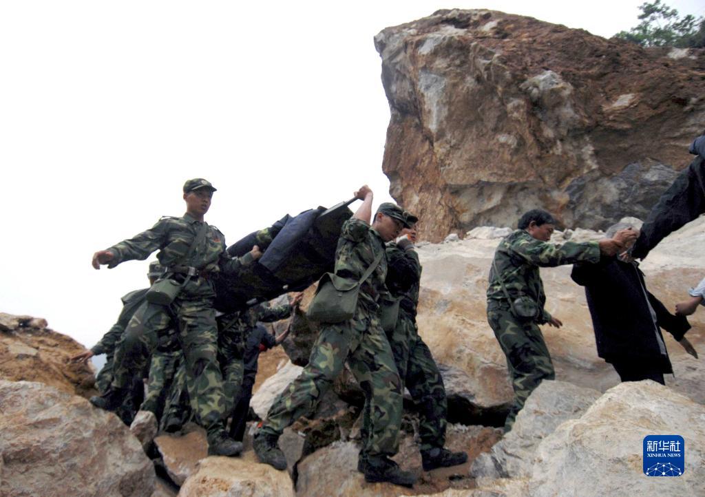 在四川省北川縣災區(qū),武警戰(zhàn)士在救援受傷者(2008年5月13日攝)。新華社記者陳燮攝