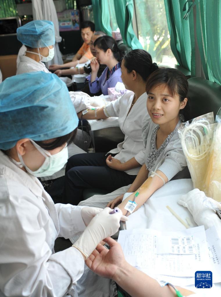 鄭州市委干部肖靜在流動獻血車上獻血(2008年5月14日攝)。2008年5月14日,數(shù)百名鄭州市直機關干部職工參加援助活動,并為汶川地震災區(qū)的受災群眾獻血。新華社記者 趙鵬 攝