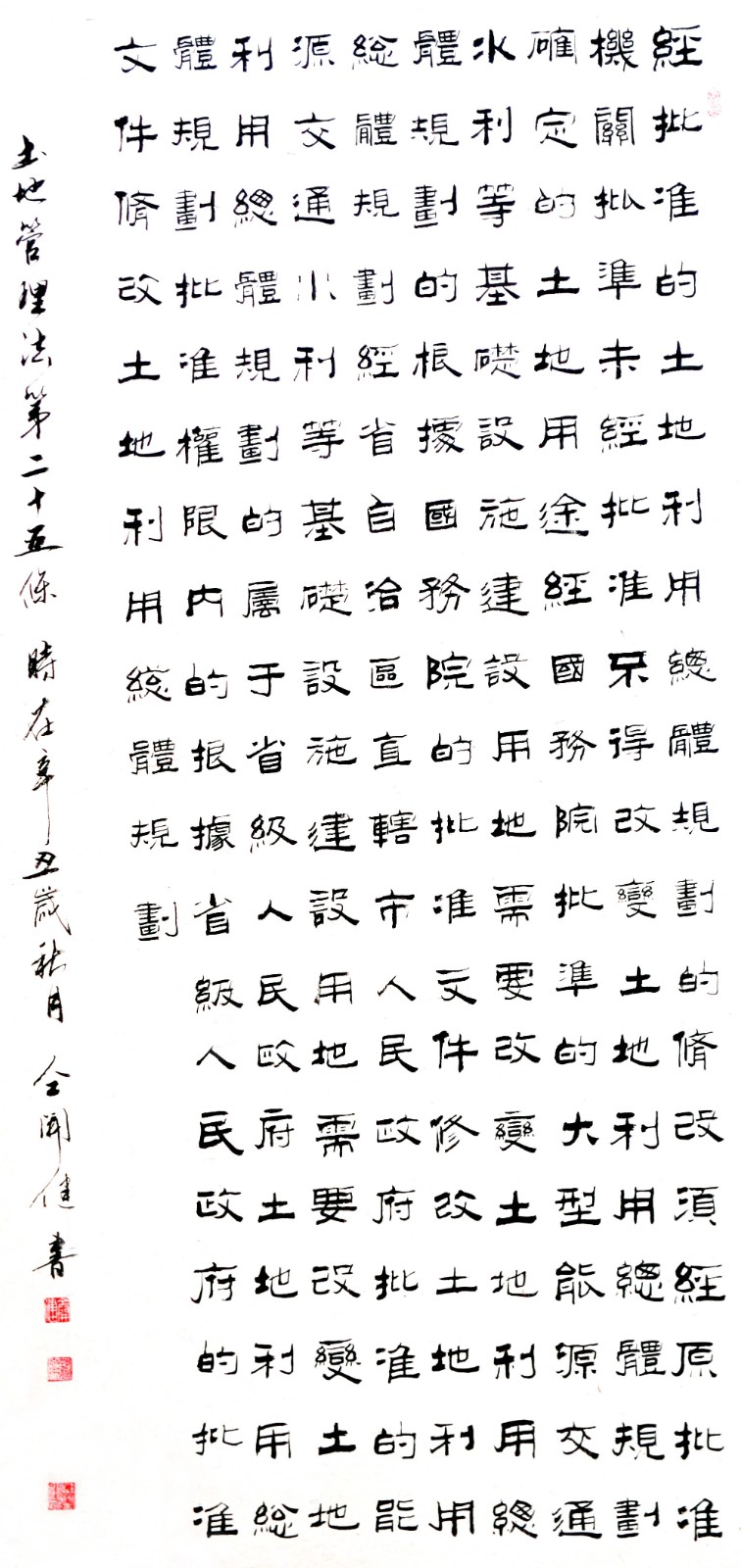 繼1600余位書法家參與書寫《中華人民共和國民法典》全部1260條法條之后,法治日報社聯合自然資源部法規(guī)司、自然資源部書畫研究會和北京昌平書法家協會,將筆端對準土地管理“一法一條例”,即《中華人民共和國土地管理法》和《中華人民共和國土地管理法實施條例》。