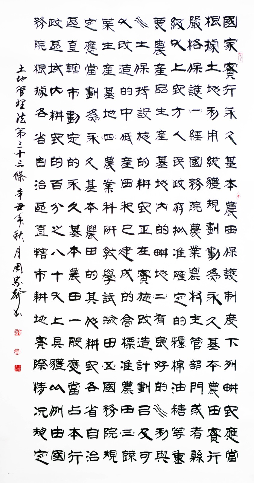 繼1600余位書法家參與書寫《中華人民共和國(guó)民法典》全部1260條法條之后,法治日?qǐng)?bào)社聯(lián)合自然資源部法規(guī)司、自然資源部書畫研究會(huì)和北京昌平書法家協(xié)會(huì),將筆端對(duì)準(zhǔn)土地管理“一法一條例”,即《中華人民共和國(guó)土地管理法》和《中華人民共和國(guó)土地管理法實(shí)施條例》。