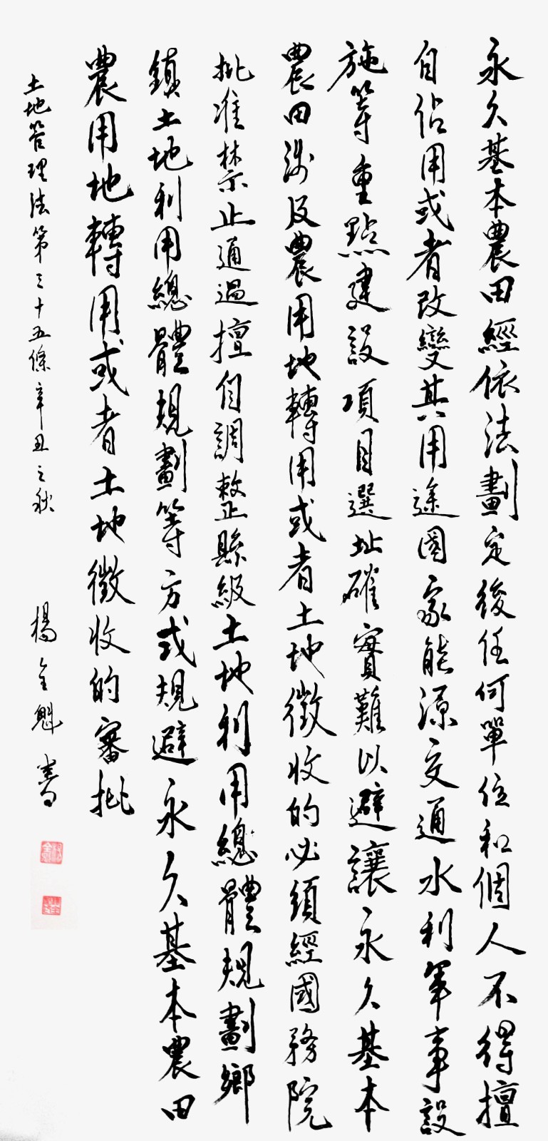 繼1600余位書法家參與書寫《中華人民共和國民法典》全部1260條法條之后,法治日報社聯(lián)合自然資源部法規(guī)司、自然資源部書畫研究會和北京昌平書法家協(xié)會,將筆端對準土地管理“一法一條例”,即《中華人民共和國土地管理法》和《中華人民共和國土地管理法實施條例》。