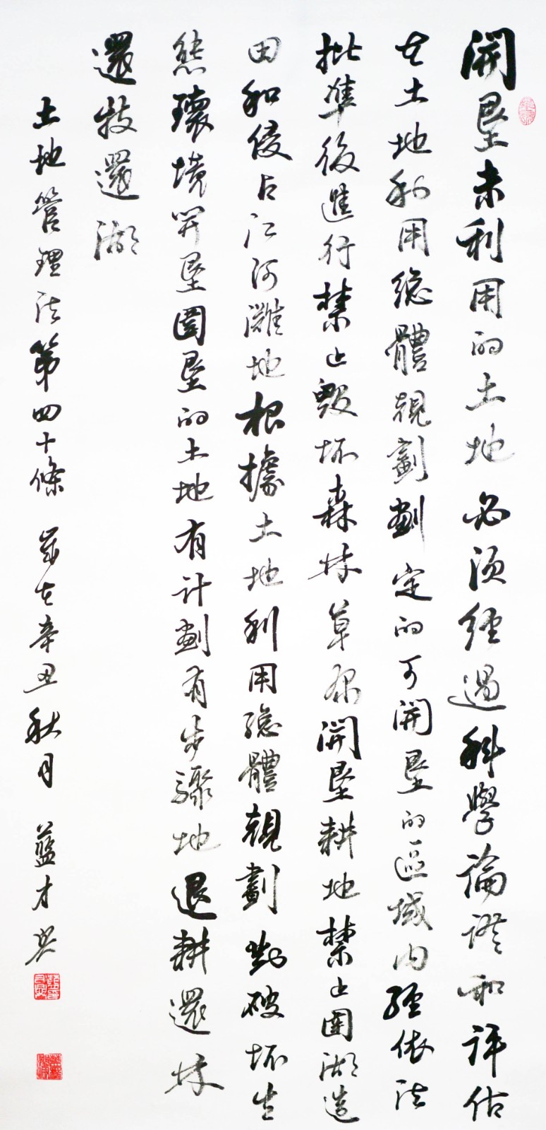 繼1600余位書法家參與書寫《中華人民共和國(guó)民法典》全部1260條法條之后,法治日?qǐng)?bào)社聯(lián)合自然資源部法規(guī)司、自然資源部書畫研究會(huì)和北京昌平書法家協(xié)會(huì),將筆端對(duì)準(zhǔn)土地管理“一法一條例”,即《中華人民共和國(guó)土地管理法》和《中華人民共和國(guó)土地管理法實(shí)施條例》。