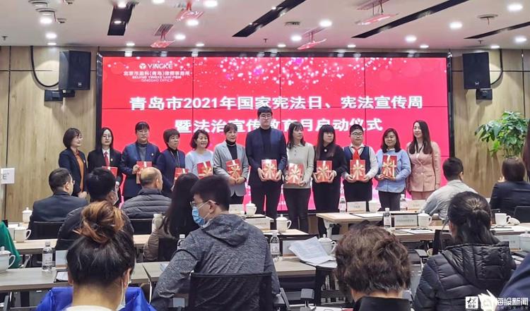 儀式在“我是憲法朗讀者”宣傳片的朗朗誦讀聲中開始,劉春穎同志與有關(guān)領(lǐng)導(dǎo)為學(xué)法講法優(yōu)秀代表贈(zèng)送憲法書籍,并宣布“青島市2021年國家憲法日、憲法宣傳周暨法治宣傳教育月主題宣傳活動(dòng)正式啟動(dòng)”。