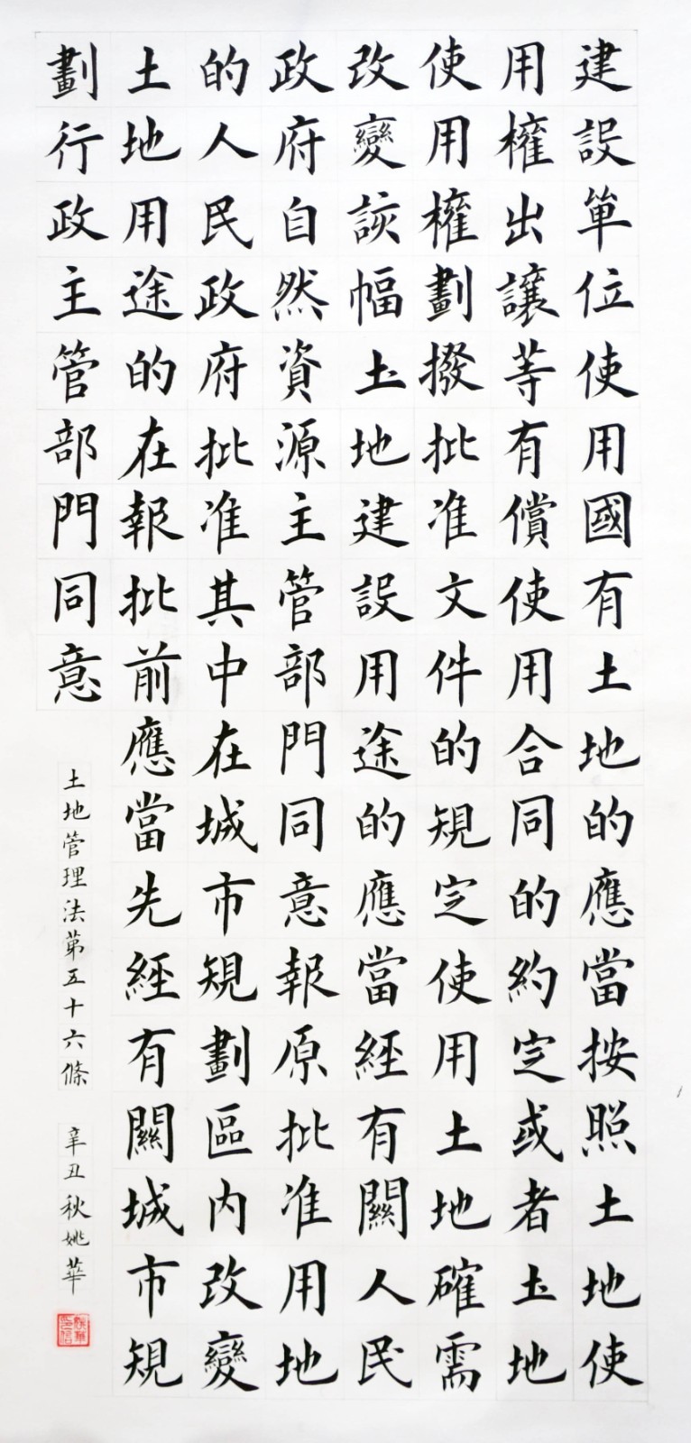 繼1600余位書法家參與書寫《中華人民共和國民法典》全部1260條法條之后,法治日報社聯(lián)合自然資源部法規(guī)司、自然資源部書畫研究會和北京昌平書法家協(xié)會,將筆端對準土地管理“一法一條例”,即《中華人民共和國土地管理法》和《中華人民共和國土地管理法實施條例》。