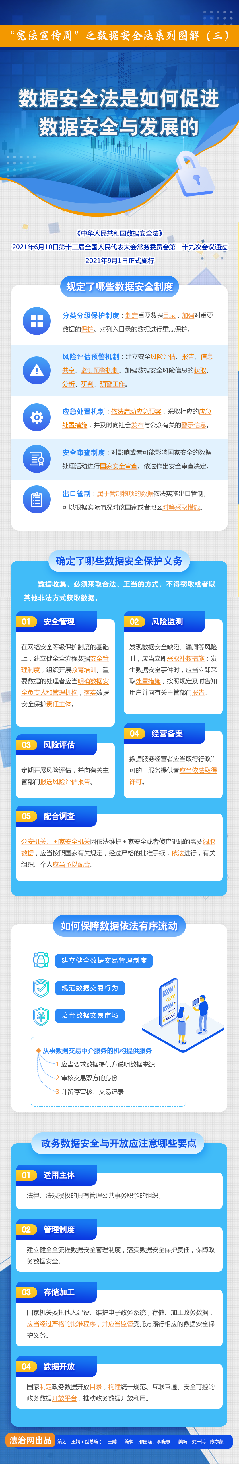 值此第四個(gè)“憲法宣傳周”之際,法治網(wǎng)將為您解讀今年9月1日起施行的《中華人民共和國(guó)數(shù)據(jù)安全法》——這部法律的亮點(diǎn)是什么?它是如何支持促進(jìn)數(shù)據(jù)安全與發(fā)展的?它又彰顯了哪些數(shù)據(jù)“溫度”?這一系列問(wèn)題,都會(huì)在法治網(wǎng)《數(shù)據(jù)安全法圖解(系列)》中找到答案。