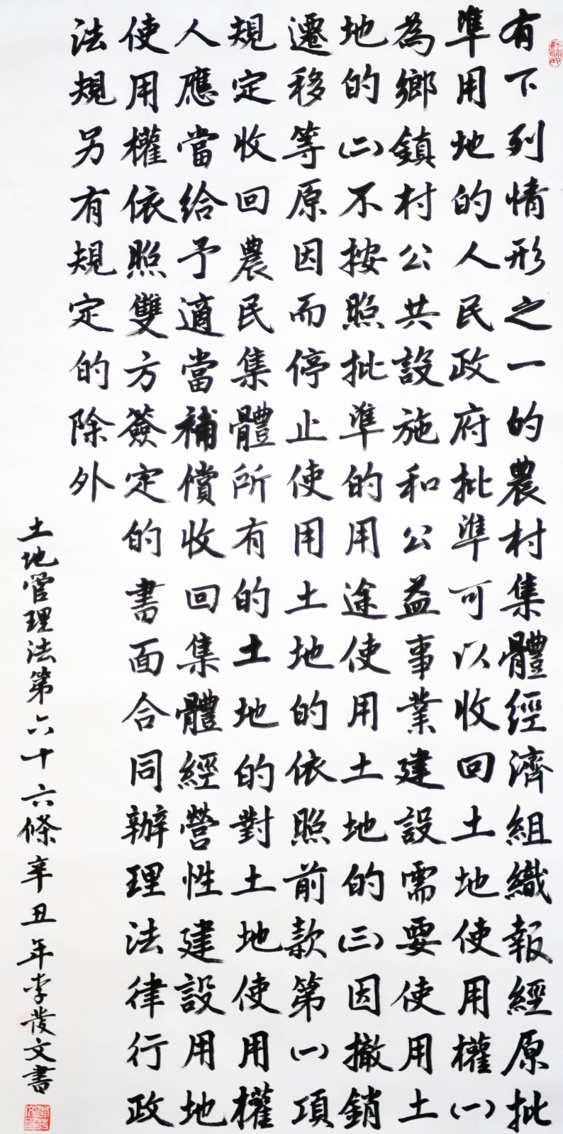 繼1600余位書法家參與書寫《中華人民共和國民法典》全部1260條法條之后,法治日報社聯(lián)合自然資源部法規(guī)司、自然資源部書畫研究會和北京昌平書法家協(xié)會,將筆端對準土地管理“一法一條例”,即《中華人民共和國土地管理法》和《中華人民共和國土地管理法實施條例》。