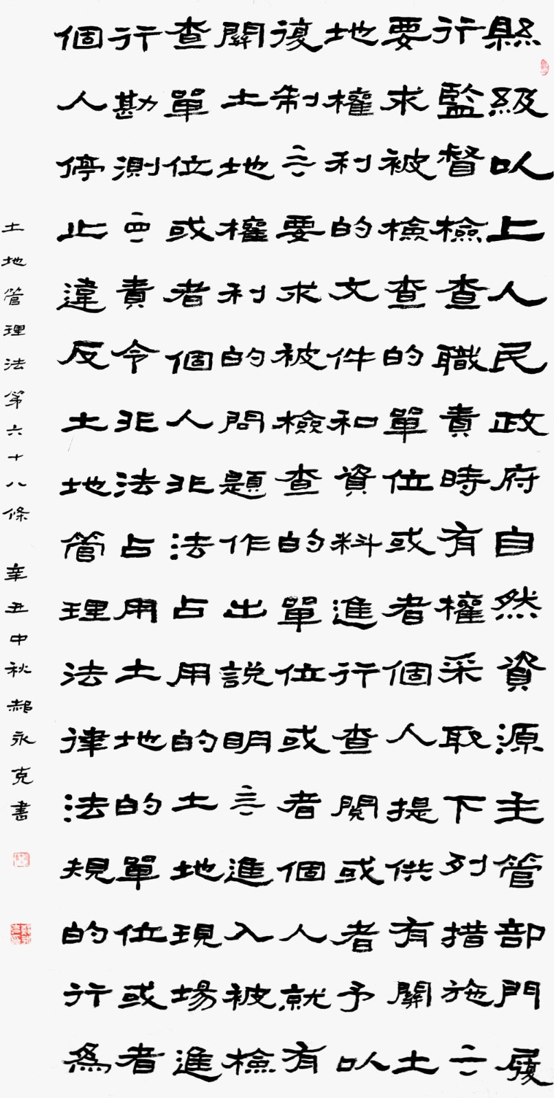 繼1600余位書法家參與書寫《中華人民共和國(guó)民法典》全部1260條法條之后,法治日?qǐng)?bào)社聯(lián)合自然資源部法規(guī)司、自然資源部書畫研究會(huì)和北京昌平書法家協(xié)會(huì),將筆端對(duì)準(zhǔn)土地管理“一法一條例”,即《中華人民共和國(guó)土地管理法》和《中華人民共和國(guó)土地管理法實(shí)施條例》。