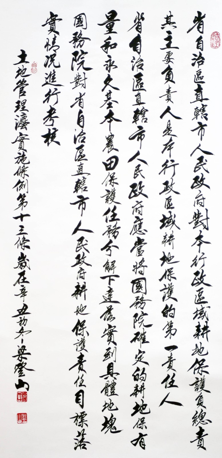 繼1600余位書法家參與書寫《中華人民共和國民法典》全部1260條法條之后,法治日?qǐng)?bào)社聯(lián)合自然資源部法規(guī)司、自然資源部書畫研究會(huì)和北京昌平書法家協(xié)會(huì),將筆端對(duì)準(zhǔn)土地管理“一法一條例”,即《中華人民共和國土地管理法》和《中華人民共和國土地管理法實(shí)施條例》。