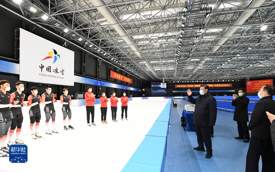 1月4日,中共中央總書記、國家主席、中央軍委主席習(xí)近平在北京考察2022年冬奧會、冬殘奧會籌辦備賽工作。這是4日下午,習(xí)近平在二七廠冰雪項目訓(xùn)練基地速滑館,向參訓(xùn)運動員、教練員表示慰問。新華社記者 謝環(huán)馳 攝