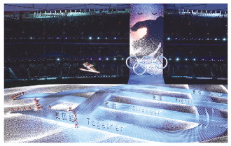 圖為開幕式上的焰火表演呈現(xiàn)出中英文“立春”和“spring”字樣。 新華社記者 邢廣利 攝