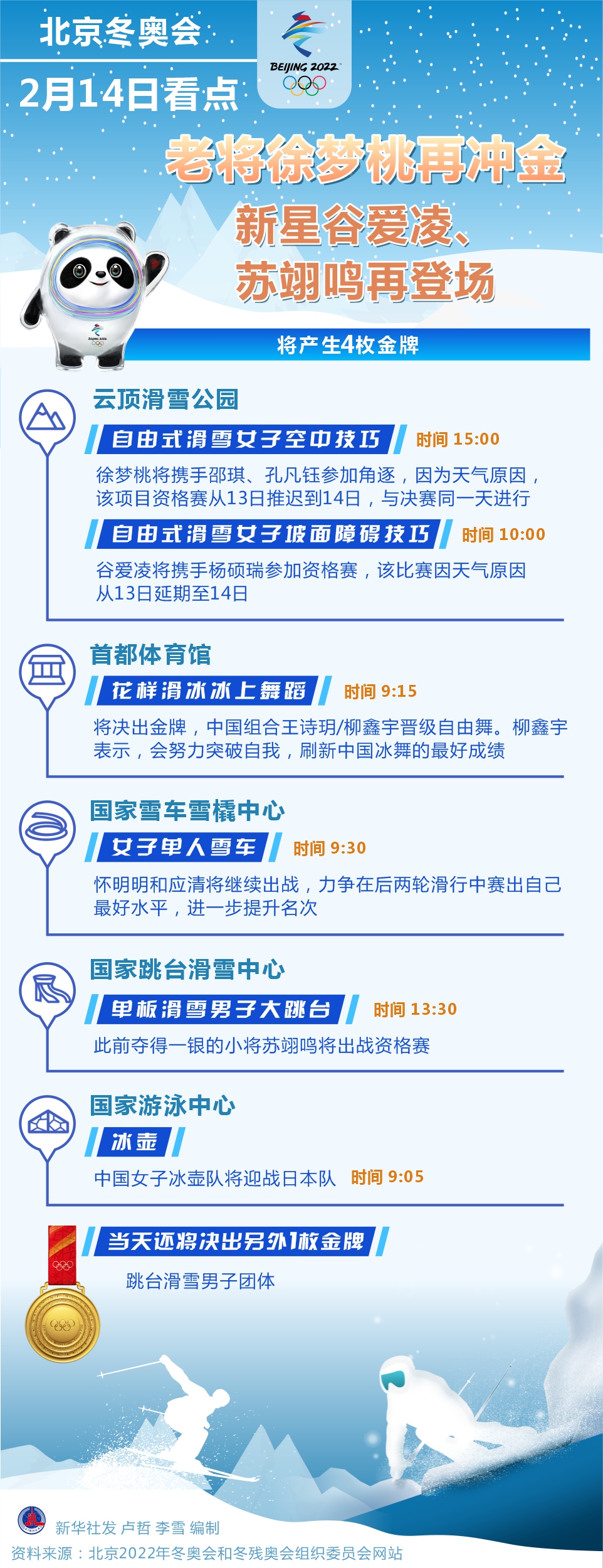 新華社北京2月13日電(記者張澤偉、王恒志)因?yàn)樘鞖庠颍本┒瑠W會(huì)部分項(xiàng)目調(diào)整了賽程,14日將產(chǎn)生4枚金牌。在自由式滑雪女子空中技巧項(xiàng)目上,中國(guó)隊(duì)實(shí)力不俗,“四朝元老”徐夢(mèng)桃將再次向金牌發(fā)起沖擊。冰舞和雪車(chē)項(xiàng)目,中國(guó)選手則將力爭(zhēng)取得突破。