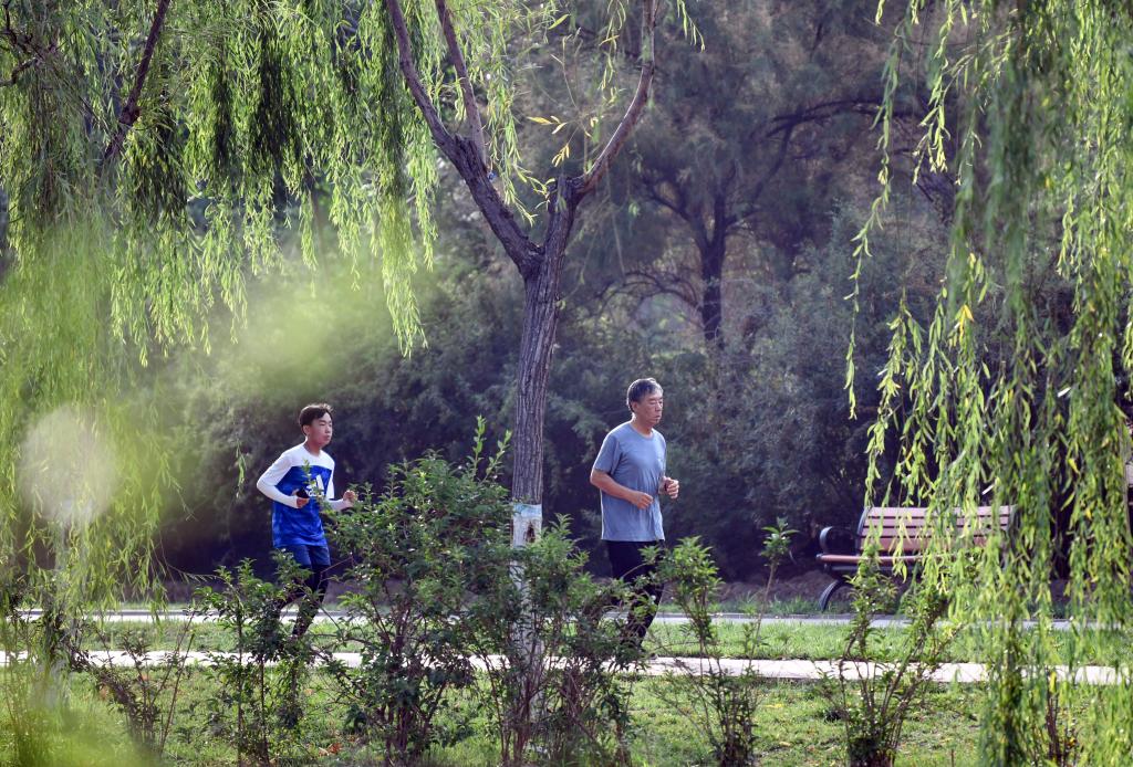 2021年7月1日,在天津市南翠屏公園,市民在公園步道上跑步健身。新華社記者 孫凡越 攝
