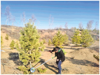 “樟子松最下端的這些枝條要剪掉,不然容易吸收水分,還會(huì)影響樟子松繼續(xù)長(zhǎng)高?!惫ㄜ娺呅藜暨呎f(shuō),“2021年我們已經(jīng)將4.5萬(wàn)畝林地全部替換完畢,現(xiàn)在基本就是陸續(xù)挖掉死去的楊樹(shù)和沙柳,補(bǔ)種上樟子松?!?/p>