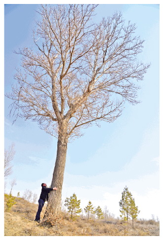 郭建軍環(huán)抱著林場(chǎng)里第一株成活的大樹(shù)。 白凌燕 攝
