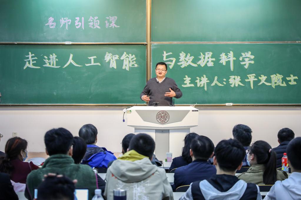 中國(guó)科學(xué)院院士張平文為南開學(xué)子講授“名師引領(lǐng)”通識(shí)課之“走進(jìn)人工智能與數(shù)據(jù)科學(xué)”。(南開大學(xué)供圖)