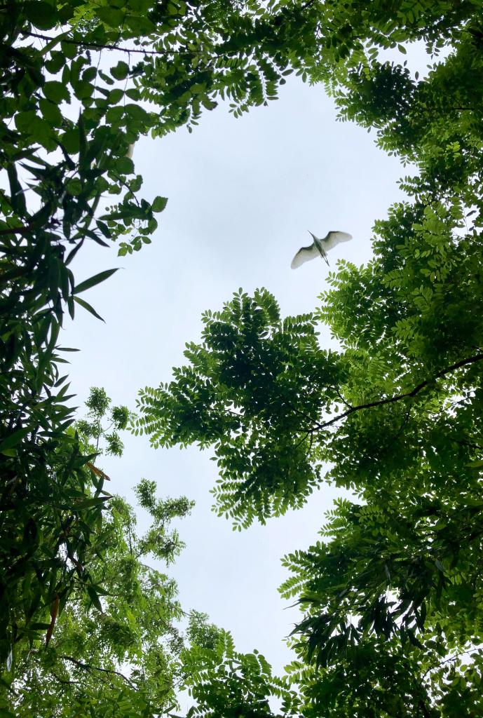 在江蘇省大豐麋鹿國家級自然保護區(qū),一只白鷺飛過樹梢。新華社記者李響攝