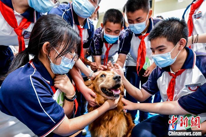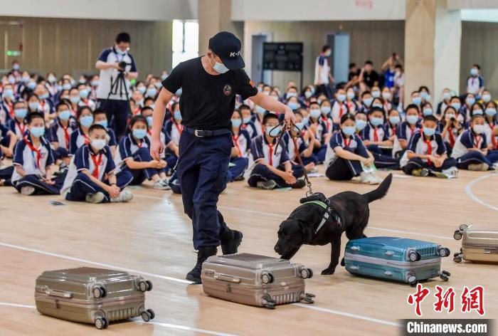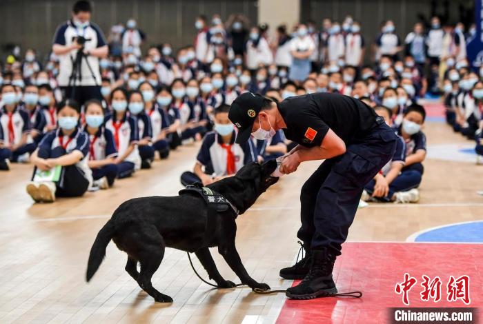 學生們與展示完搜索毒品技能的緝毒犬親密互動。 劉新 攝