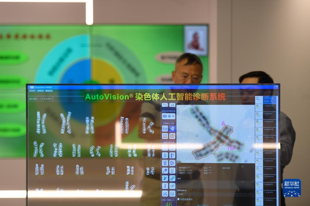 參加中國(杭州)數(shù)字·健康小鎮(zhèn)開園儀式的嘉賓在小鎮(zhèn)的成果轉化區(qū)了解一套染色體人工智能診斷系統(tǒng)(2020年8月30日攝)。新華社記者 黃宗治 攝