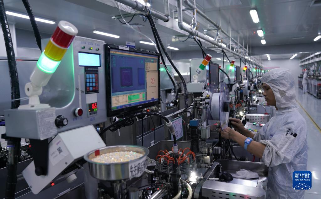 江西兆馳光元科技股份有限公司的工作人員在車間進(jìn)行LED封裝編帶工序(2021年6月25日攝)。新華社記者 胡晨歡 攝