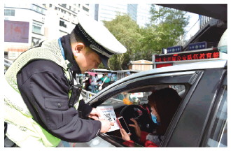 為提升嚴格規(guī)范公正文明執(zhí)法的能力水平,四川省綿陽市公安局交警支隊啟動“民警執(zhí)法服務評價系統(tǒng)”。圖為2021年3月22日,民警向駕駛?cè)私榻B評價系統(tǒng)的使用方法。 本報通訊員 張悅 攝