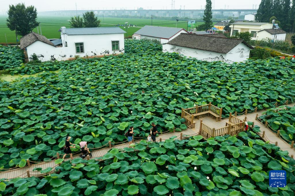 人們在四川省眉山市東坡區(qū)太和鎮(zhèn)永豐村欣賞荷塘美景,荷塘旁邊就是村里處理生活污水所用的埋于地下的污水收集池、沉渣池、四級厭氧池等(2022年6月22日攝)。新華社記者 沈伯韓 攝