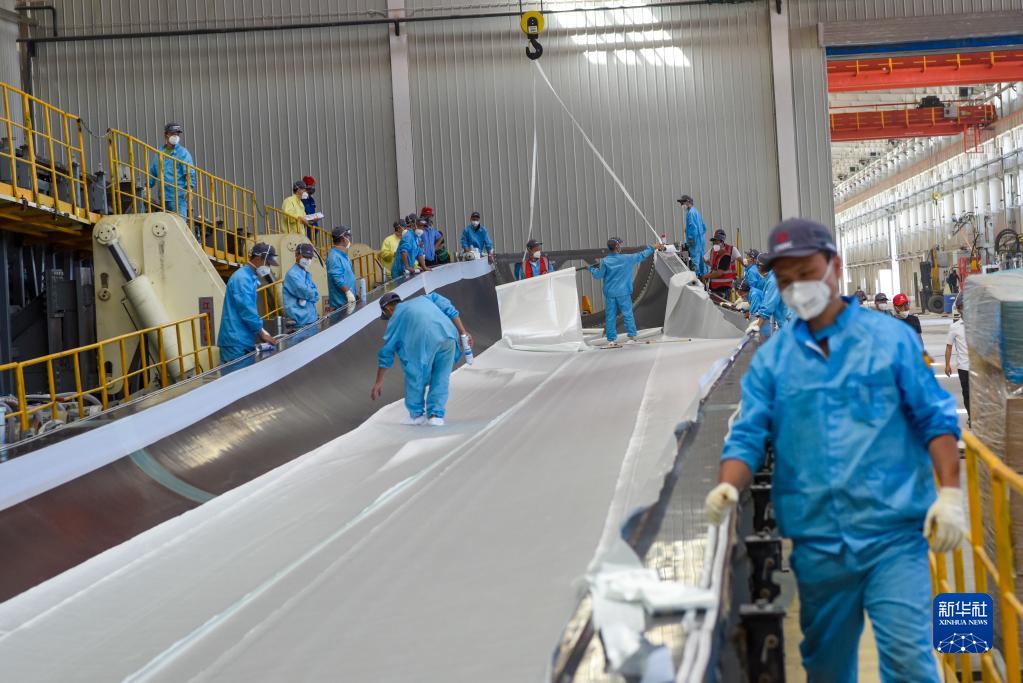 新疆生產(chǎn)建設(shè)兵團(tuán)新星經(jīng)濟(jì)技術(shù)開(kāi)發(fā)區(qū)一家風(fēng)電葉片企業(yè)的員工在車(chē)間忙碌(2022年7月27日攝)。新華社記者 丁磊 攝