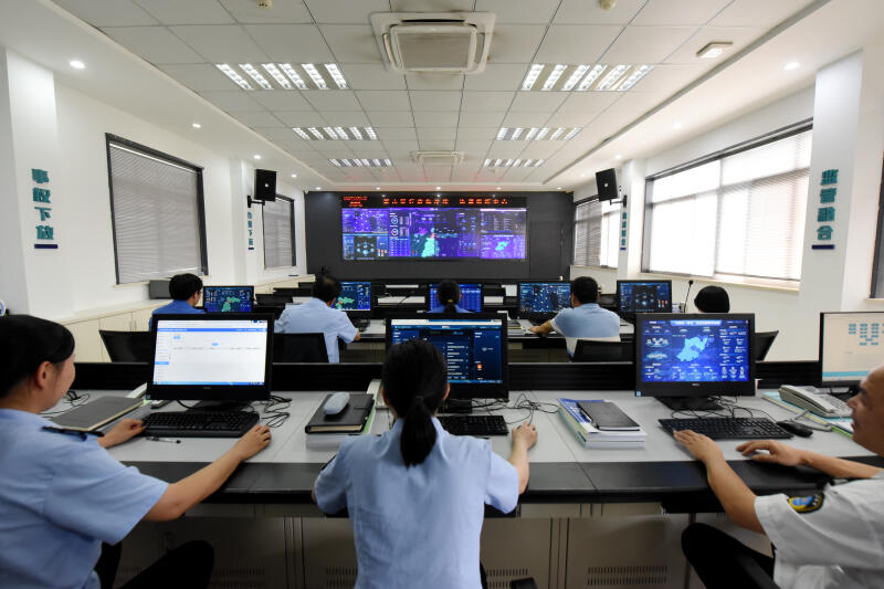 9月6日,“良法善治”網(wǎng)絡(luò)主題宣傳活動(dòng)啟動(dòng)儀式在浙江杭州舉行,活動(dòng)旨在展現(xiàn)各地法治創(chuàng)新實(shí)踐。儀式結(jié)束后,記者來(lái)到杭州市蕭山區(qū)綜合行政執(zhí)法局,在工作人員的帶領(lǐng)下參觀(guān)行政執(zhí)法統(tǒng)一協(xié)調(diào)指揮中心。