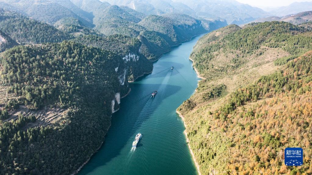 運載磷礦石的貨船沿烏江航道順流航行(2021年11月18日攝,無人機照片)。 新華社記者 陶亮 攝