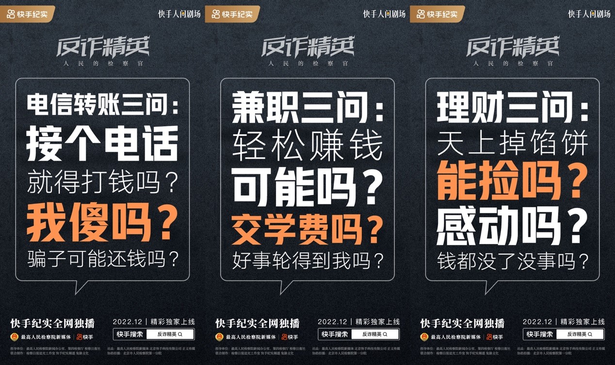 單親媽媽為何深陷“殺豬盤”執(zhí)迷不悟?什么樣的項目專騙老年人還屢屢得手?詐騙分子如何一人分飾多角?現(xiàn)實中,電信網(wǎng)絡(luò)詐騙犯罪愈演愈烈,亟需人們提高警惕。近日,反電信網(wǎng)絡(luò)詐騙法正式施行。由最高人民檢察院新聞辦公室、第四檢察廳及檢察日報社指導(dǎo),最高人民檢察院新媒體、快手及正義傳媒聯(lián)合出品的反詐主題紀實短劇《反詐精英——人民的檢察官》(以下簡稱“《反詐精英》”)于2022年12月10日在快手獨家上線,@最高人民檢察院 @正義網(wǎng) 兩大快手賬號首發(fā)?!斗丛p精英》從奮戰(zhàn)在辦案一線的人民檢察官視角出發(fā),以富有戲劇張力的紀實短劇形式講述真實反詐故事,創(chuàng)新呈現(xiàn)專業(yè)普法內(nèi)容。