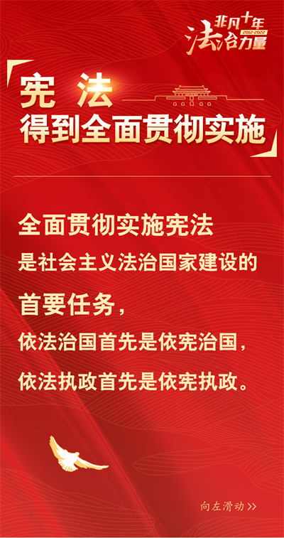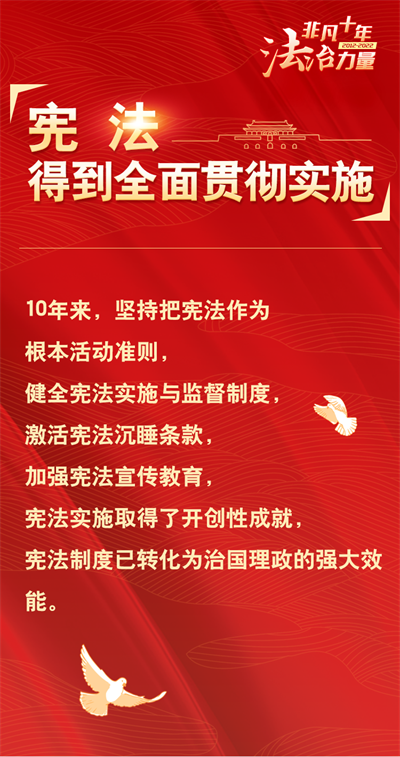 法治網(wǎng)精心策劃制作十期海報,帶您一起領略非凡十年的法治力量!今天為您奉上第三期“憲法得到全面貫徹實施”。